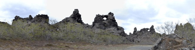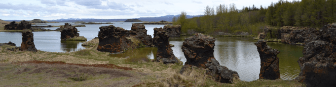 Stakholstjorn, a lake with interesting rock formations. These are lava pillars which are common in the Myvatn area. They were formed by steam cooling a molten lava lake. When the lava drains away, leaving the rock formation cooled by the steam vents. The convincing theory was supported by similar rock formations found in the deep sea, hard to imagine really.