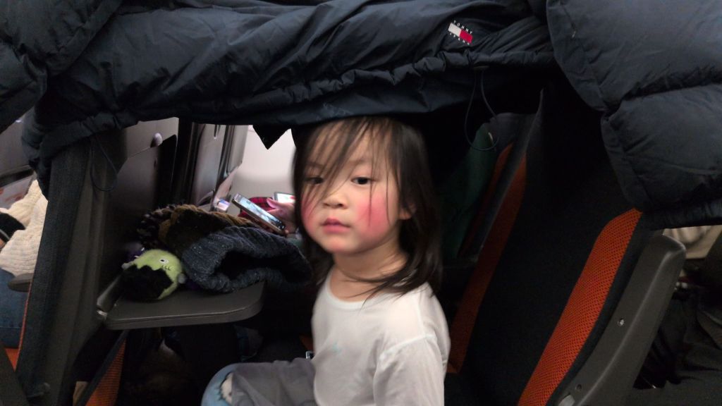 The first delay was a two hour delay before take off. Everyone was a bit upset but Sophia knew more time to play. She drew with me, sang quietly, played with her neighbours and made a tent. She survived without any screen time which was a surprise. Nowadays digital screens are part of our lives. Old school play pretending is still fun and her brother done a great job in playing together.